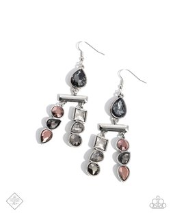Pressed in a silver fitting, a smoky teardrop gives way to a horizontal silver fitting which then gives way to stacked duos of copper aurum, smoky, and silver gems in round, teardrop, and square-cut frames for a dramatically dazzling lure. Earring attaches to a standard fishhook fitting.
