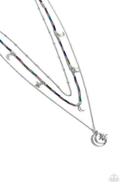 Three delicate chains cascade in various lengths across the chest, creating a radiantly layered display. Alternating between purple and oil spill glass beads, a cosmic collection of silver stars and crescent moon charms sporadically dot the uppermost chain. The centermost chain is accented with dainty silver studs, while an oversized silver crescent moon embellished with a sparkling three-dimensional silver star creates a heavenly pendant at the bottom of the longest chain in a radiant finish. Features an adjustable clasp closure. Due to its prismatic palette, color may vary.