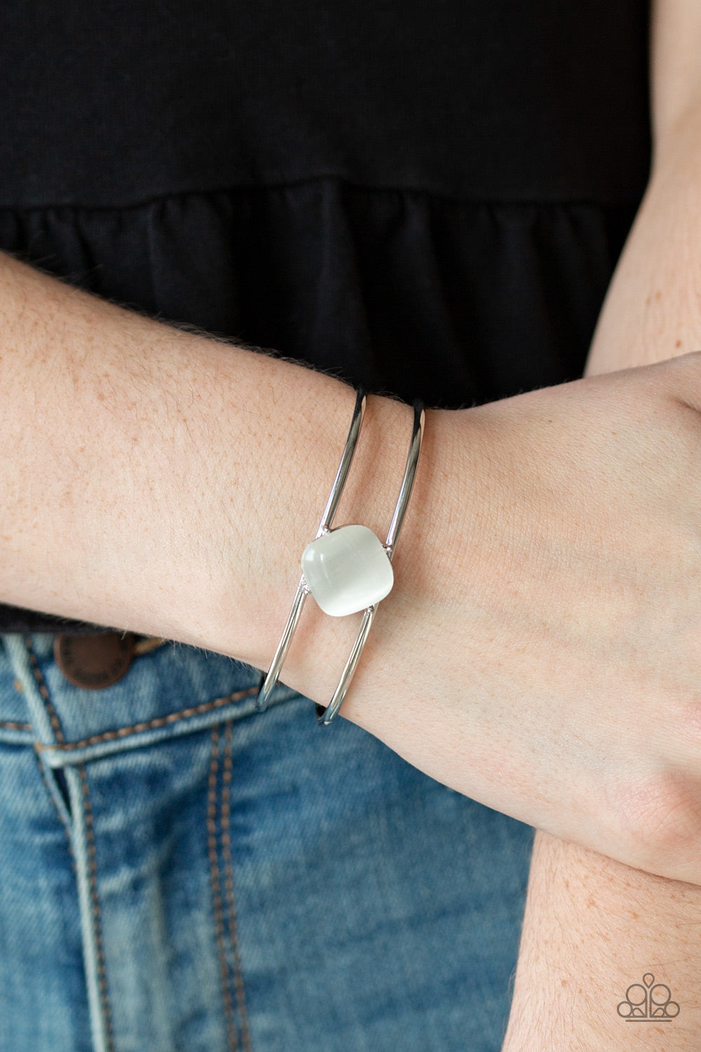 Chiseled into a tranquil square, a glowing white moonstone is pressed into the center of an airy silver cuff for a perfect pop of color.